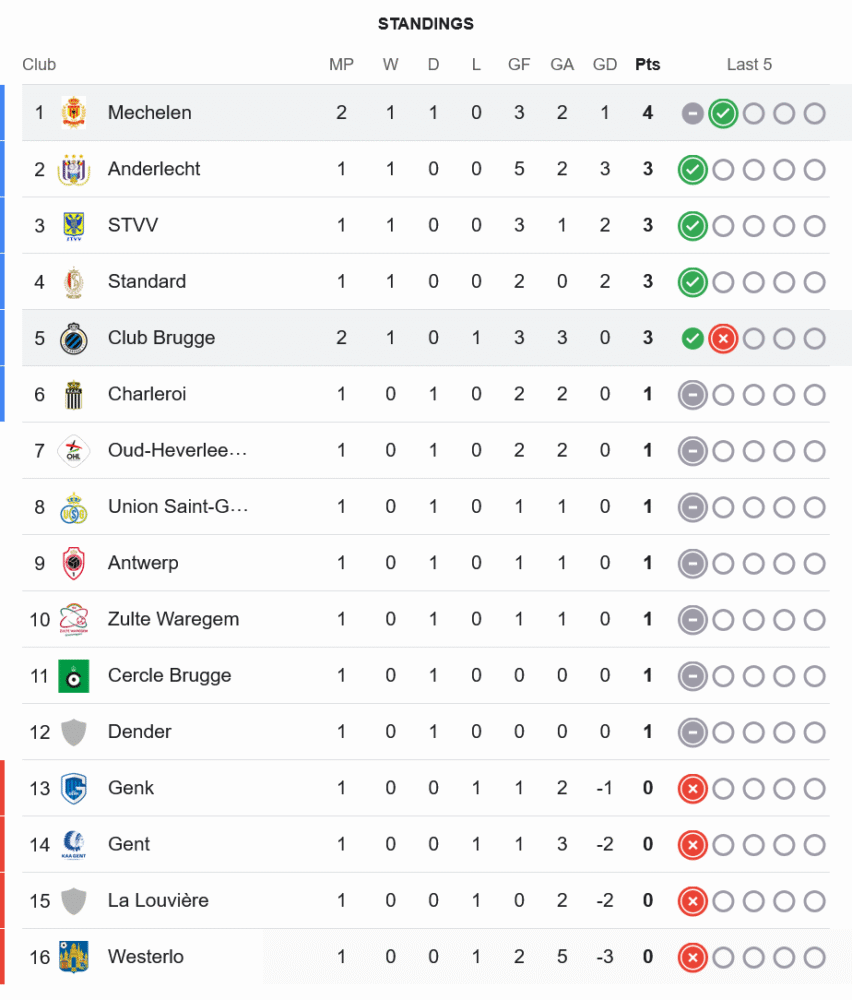 หลังเกมนี้ เมเชเลนเก็บเพิ่มเป็น 4 แต้มจาก 2 นัด ขึ้นนำเป็นจ่าฝูงของลีก ส่วนคลับ บรูซแพ้นัดแรกในซีซั่น รั้งอันดับ 5 มี 3 แต้มจาก 2 เกม และต้องเร่งเก็บชัยนัดถัดไปเพื่อรักษาระยะห่างกับกลุ่มบน โดยเฉพาะเมื่อทีมใหญ่ทั้งอันเดอร์เลชท์และสตองดาร์ดต่างเก็บชัยได้เช่นกัน