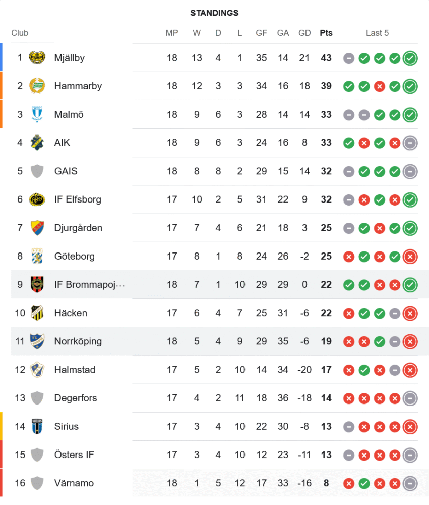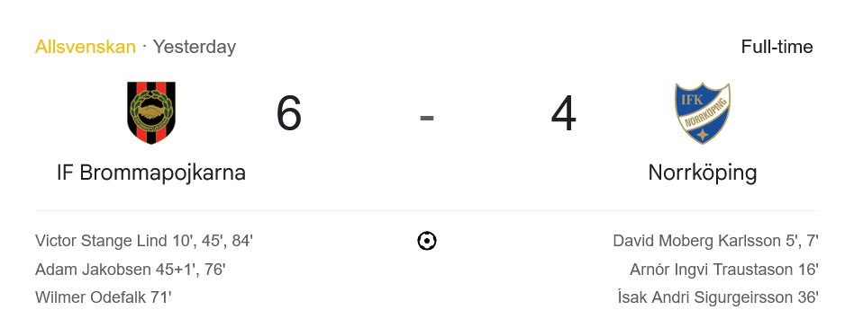 3 แต้มจากเกมนี้ช่วยให้ บรอมมาปอจคาร์น่า ขยับขึ้นมาอยู่อันดับ 9 มี 22 คะแนนจาก 18 นัด ไล่จี้โซนบนตารางต่อไป ส่วน นอร์โคปิ้ง ฟอร์มยังไม่กระเตื้อง หล่นลงมาอยู่ที่ 11 มีเพียง 19 แต้ม ห่างจากโซนตกชั้นแค่ 4 คะแนน ต้องรีบฟื้นฟอร์มด่วนก่อนจะสายเกินไป