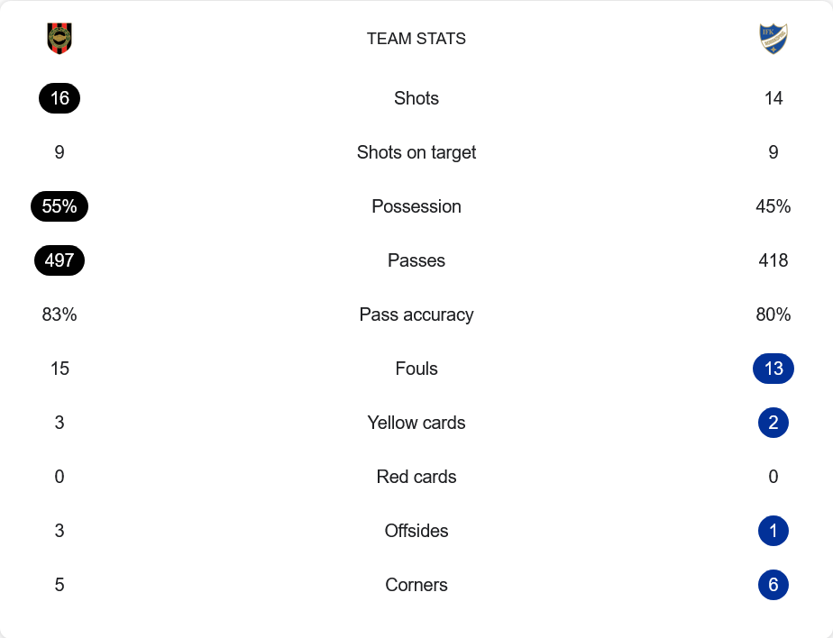 บรอมมาปอจคาร์น่า ยิงทั้งหมด 16 ครั้ง เข้ากรอบ 9 ครั้ง เท่ากับนอร์โคปิ้งที่มีโอกาสยิง 14 ครั้ง เข้ากรอบ 9 ครั้งเช่นกัน บรอมมาปอจคาร์น่าครองบอล 55% จ่ายบอลไป 497 ครั้ง ความแม่นยำ 83% ส่วนทีมเยือนครองบอล 45% จ่าย 418 ครั้ง ความแม่นยำ 80% ทั้งสองทีมมีจำนวนฟาวล์ใกล้เคียงกัน โดยเจ้าบ้านฟาวล์ 15 ครั้ง ทีมเยือนฟาวล์ 13 ครั้ง บรอมมาปอจคาร์น่าโดนใบเหลือง 3 ใบ ขณะที่นอร์โคปิ้งได้ใบเหลือง 2 ใบ
