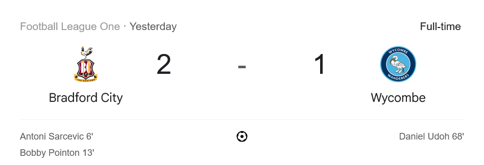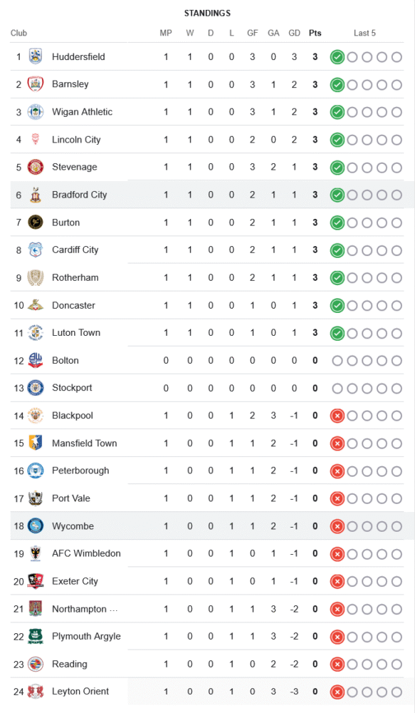 แบรดฟอร์ด ซิตี้ ประเดิมด้วย 3 แต้ม ขึ้นไปรั้งอันดับ 6 ชั่วคราวในตาราง ลีกวัน ถือเป็นการเริ่มต้นที่มั่นคงและเรียกความมั่นใจได้มาก ขณะที่ วีคอมบ์ วันเดอเรอร์ส ยังไม่มีแต้ม และรั้งอันดับ 18 ต้องเร่งเรียกฟอร์มกลับโดยเร็วเพื่อหนีจากโซนล่าง