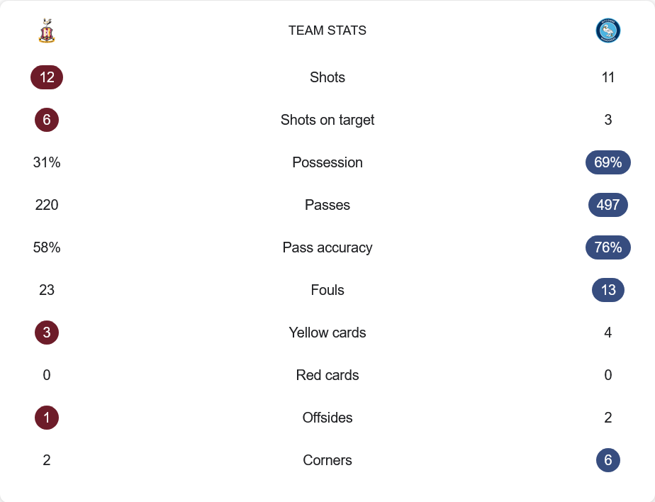 จากการ วิเคราะห์บอล เชิงลึก เกมนี้ชัดเจนว่าแบรดฟอร์ดวางแผนเน้นเกมเร็ว ใช้การเข้าทำเพียงไม่กี่จังหวะแต่ได้ผลลัพธ์สูง เกมรับยืนลึกแต่ไม่เสียสมาธิ การครองบอลเพียง 31% แต่กลับเปลี่ยนโอกาส 12 ครั้งเป็น 2 ประตู ถือว่าใช้โอกาสอย่างคุ้มค่า ขณะที่วีคอมบ์เน้นครองบอล บุกจากปีกทั้งสองฝั่งแต่ขาดความเฉียบคมในจังหวะสุดท้าย ครองบอลมากถึง 69% แต่ยิงตรงกรอบเพียง 3 ครั้ง สะท้อนชัดว่าเกมรุกยังต้องปรับจูน จังหวะต่อบอลแม่นก็จริง แต่จบสกอร์ยังไม่เฉียบเท่าเจ้าถิ่น