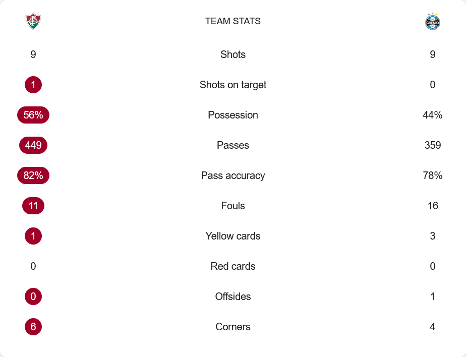 ฟลูมิเนนเซ่ และ เกรมิโอ้ มีโอกาสยิงเท่ากันที่ 9 ครั้ง แต่ที่แตกต่างคือความแม่นยำของเจ้าบ้านที่ยิงตรงกรอบ 1 ครั้งและเป็นประตู ส่วนทีมเยือนไม่สามารถยิงตรงกรอบได้เลย การครองบอลเป็นของฟลูมิเนนเซ่ที่ 56% พร้อมความแม่นยำในการจ่ายบอล 82% ขณะที่เกรมิโอ้อยู่ที่ 78% ด้านเกมรับ เกรมิโอ้ทำฟาวล์มากถึง 16 ครั้ง และได้ใบเหลือง 3 ใบ เทียบกับฟลูมิเนนเซ่ที่ทำฟาวล์ 11 ครั้ง และรับใบเหลือง 1 ใบ