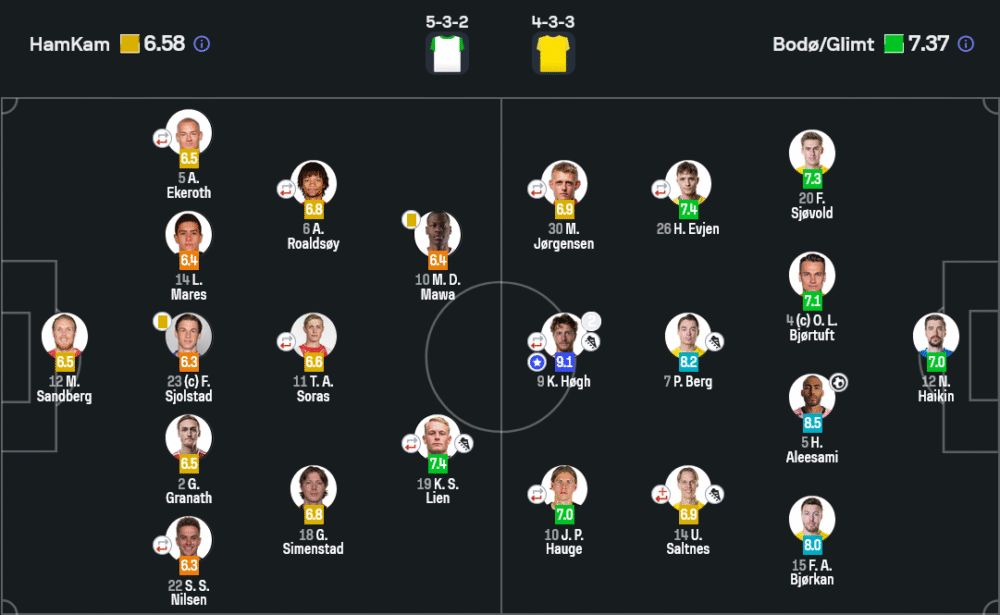 วิเคราะห์บอล เกมนี้สะท้อนชัดถึงความแตกต่างในเชิงกลยุทธ์ ฮามคาม วางแผน 5-3-2 โดยหวังตั้งรับลึกแล้วสวนกลับเร็ว ทว่าการจ่ายบอลของพวกเขาขาดความแม่นยำ และเกมบุกขาดความต่อเนื่อง แม้จะมีจังหวะยิง 10 ครั้ง แต่เข้ากรอบเพียง 4 ครั้ง ส่วน โบโด กลิมท์ เล่นด้วยแผน 4-3-3 ที่เน้นเกมรุกดุดัน ขึ้นเกมเร็วจากริมเส้น และจบสกอร์เฉียบขาด พวกเขาครองบอลได้ถึง 65% และจ่ายบอลแม่นยำถึง 88% เจาะเกมรับของฮามคามได้บ่อยครั้ง นำมาซึ่ง 3 ประตูที่เกิดจากการวางหมากที่แม่นยำและการเคลื่อนที่ของผู้เล่นที่สอดรับกันอย่างยอดเยี่ยม