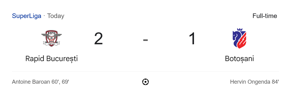 ศึกโรมาเนียน ซูเปอร์ลีกา คืนวันที่ 5 สิงหาคม 2568 ที่ผ่านมา “ราปิด บูคาเรสต์” ยังรักษาความร้อนแรงไว้ได้อย่างต่อเนื่องหลังเปิดบ้านเบียดเอาชนะ “โบโตซานี่” 2-1 โดยได้สองประตูจากฟอร์มร้อนของ อองตวน บาโรอัง ที่ลงสนามครึ่งหลังและซัดคนเดียวเบิ้ลในเวลา 9 นาที พาเจ้าบ้านเก็บสามแต้มเต็ม พร้อมนำเป็นจ่าฝูงต่อไปอย่างสง่างาม บ้านกีฬา พาแฟนบอลเกาะติด ผลบอลสด แบบเข้มข้นทุกจังหวะที่สนาม