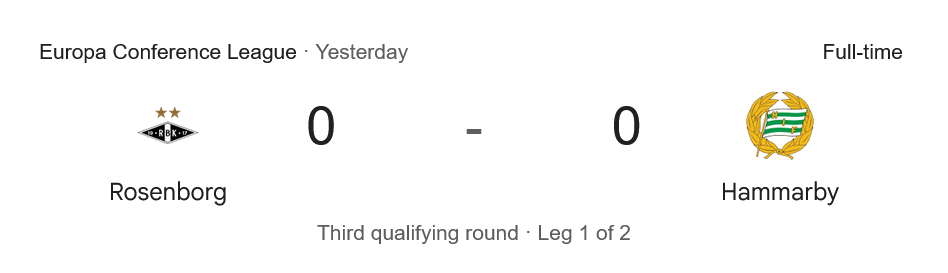 เกมรอบคัดเลือก ยูฟ่า ยูโรปา คอนเฟอเรนซ์ลีก รอบสาม นัดแรกระหว่าง โรเซนบอร์ก ทีมแกร่งจากนอร์เวย์ และ ฮัมมาร์บี้ จากสวีเดน จบลงด้วยผลเสมอแบบไร้สกอร์ 0-0 แม้จะไม่มีประตู แต่รูปเกมเต็มไปด้วยความเข้มข้น การเข้าปะทะดุเดือด และจังหวะลุ้นระทึกตลอด 90 นาที ซึ่งแฟนบอลที่ติดตาม ผลบอลสด ต่างพูดเป็นเสียงเดียวกันว่าแมตช์นี้ “เดือดแต่จบเจ๊า”