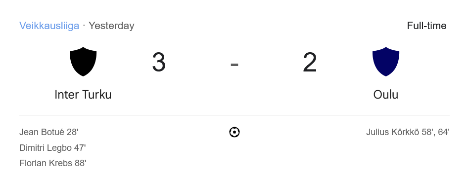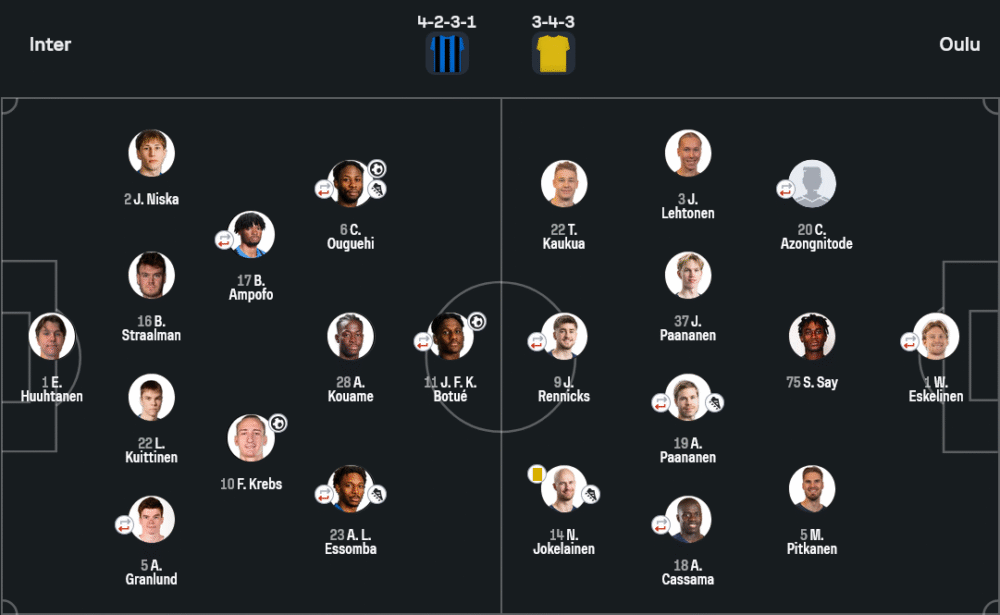 การเปลี่ยนตัว: 66’ J. Tuominen แทน Botué, 77’ S. Saarinen แทน Granlund, 77’ J. Yli-Kokko แทน Ouguehi, 84’ J. Kekarainen แทน Ampofo, 84’ M. Sarr แทน Essomba