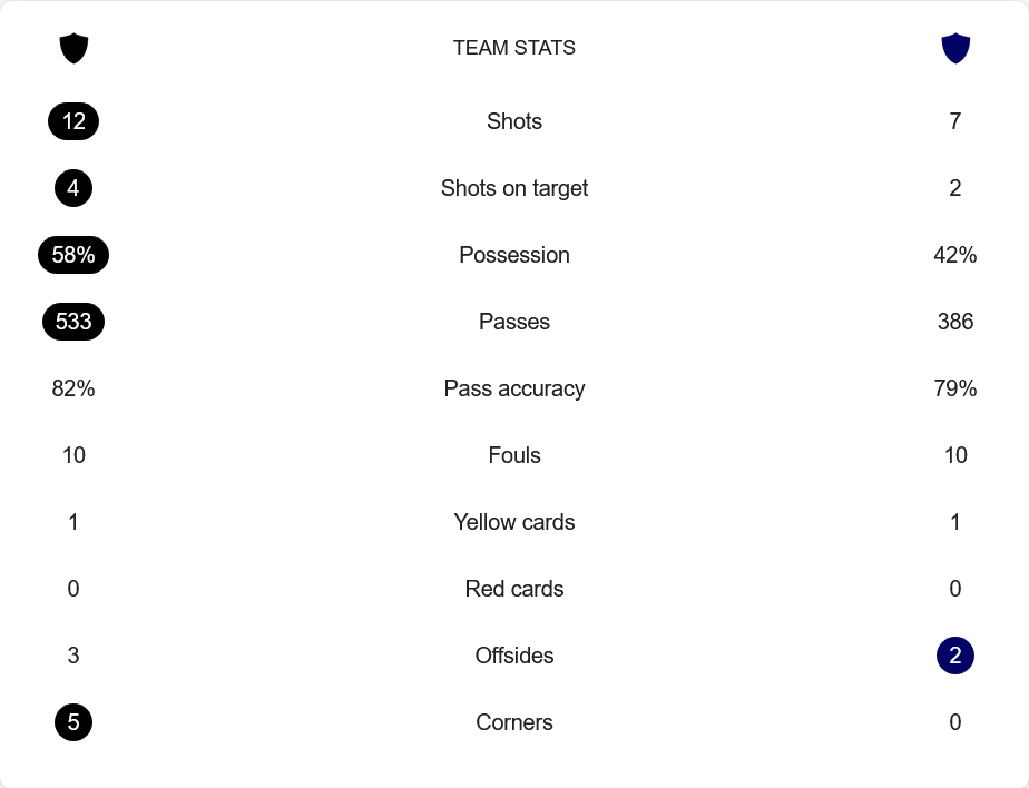 อินเตอร์ ตูร์คู เหนือกว่าชัดเจนในหลายด้าน ครองบอล 58% เทียบกับ 42% ของเอซี โอลู สร้างโอกาสยิง 12 ครั้ง เข้ากรอบ 4 ครั้ง ขณะที่ทีมเยือนยิง 7 ครั้ง เข้ากรอบ 2 ครั้งซึ่งเป็นสองประตูของ Körkkö การจ่ายบอลเจ้าบ้านแม่นยำ 82% จาก 533 ครั้ง ส่วนทีมเยือนแม่นยำ 79% จาก 386 ครั้ง ฟาวล์เท่ากันที่ 10 ครั้ง ใบเหลืองทีมละ 1 ใบ เตะมุมเจ้าบ้านได้ถึง 5 ครั้ง ทีมเยือนไม่มีเลย