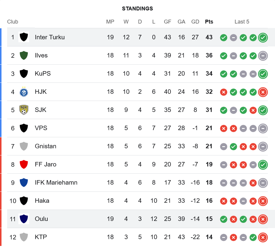 อินเตอร์ ตูร์คู เก็บเพิ่มเป็น 43 แต้มจาก 19 นัด ยึดจ่าฝูงต่อเนื่อง ทิ้งห่าง อิลเวส 7 แต้มแม้แข่งมากกว่า 1 นัด โอกาสลุ้นแชมป์ยังสดใส ส่วนเอซี โอลู แพ้นัดนี้ทำให้มี 15 แต้มจาก 19 นัด รั้งอันดับ 11 รองบ๊วย ความกดดันในการหนีตกชั้นเพิ่มขึ้นอย่างมาก