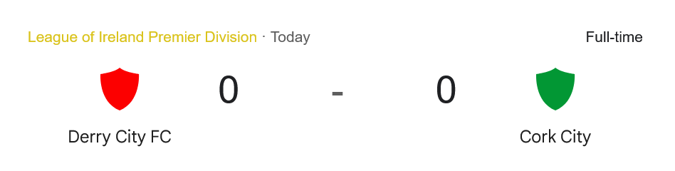บ้านกีฬา เกาะติด บ้านผลบอล ศึกพรีเมียร์ ดิวิชั่น ไอร์แลนด์ ที่ เดอะ แบรนดี้เวลล์ สเตเดี้ยม เดอร์รี่ ซิตี้ รองจ่าฝูงที่ต้องการสามแต้มเพื่อไล่บี้ แชมร็อค โรเวอร์ส เปิดบ้านดวล คอร์ก ซิตี้ ทีมบ๊วยที่กำลังหนีตกชั้น แม้อันดับต่างกันลิบลับ แต่รูปเกมเต็มไปด้วยความดุเดือด ทว่า ผลบอลสด กลับจบแบบไร้สกอร์ 0-0 ทำเอากองเชียร์เจ้าถิ่นผิดหวังถ้วนหน้า