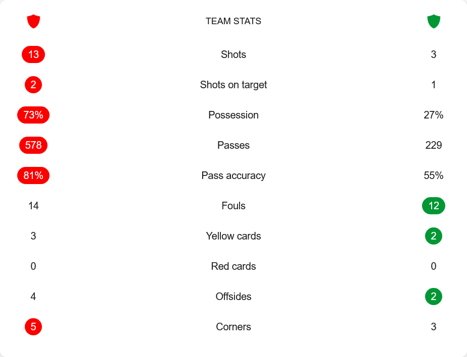เดอร์รี่ ซิตี้ ครองบอลมากถึง 73% ยิง 13 ครั้ง เข้ากรอบเพียง 2 ส่วนคอร์ก ซิตี้ ครองบอลแค่ 27% ยิง 3 ครั้ง เข้ากรอบ 1 เดอร์รี่จ่ายบอล 578 ครั้ง แม่นยำ 81% ทีมเยือนจ่ายเพียง 229 ครั้ง แม่นยำ 55% ฟาวล์ใกล้เคียงกัน 14 ต่อ 12 ใบเหลืองรวม 5 ใบ (เจ้าบ้าน 3 ทีมเยือน 2) เตะมุม เดอร์รี่ 5 ครั้ง คอร์ก 3 ครั้ง