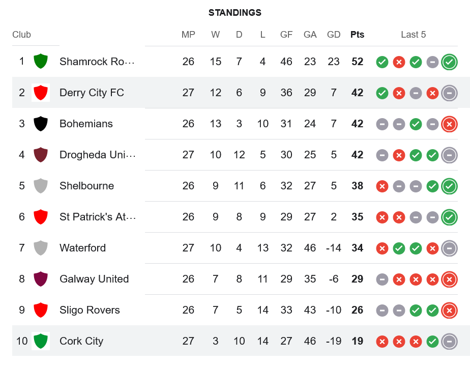 ผลเสมอทำให้ เดอร์รี่ ซิตี้ เก็บเพิ่มเป็น 42 แต้ม เท่ากับ โบฮีเมียนส์ และ ดร็อกเฮดา ยูไนเต็ด แต่ยังอยู่อันดับสองด้วยผลต่างประตูได้เสีย ส่วนคอร์ก ซิตี้ได้แต้มสำคัญเพิ่มเป็น 19 แต้ม แต่ยังรั้งบ๊วย ความหวังหนีตกชั้นยังต้องดิ้นรนต่อเนื่อง