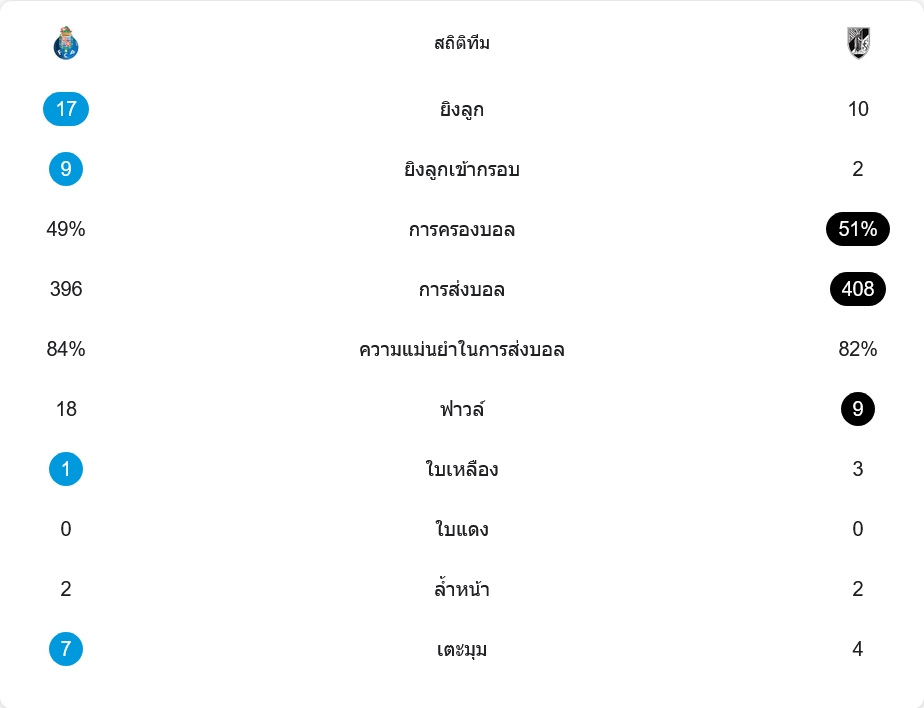 แม้ปอร์โต้ครองบอลน้อยกว่าเล็กน้อย (49% ต่อ 51%) แต่ความอันตรายอยู่ที่ประสิทธิภาพการจบสกอร์ ยิงทั้งหมด 17 ครั้ง เข้ากรอบ 9 ครั้ง ขณะที่วิตอเรียยิงได้เพียง 10 ครั้ง เข้ากรอบเพียง 2 เกมนี้เจ้าถิ่นมีความแม่นยำในการจ่ายบอล 84% จากจำนวน 396 ครั้ง ส่วนทีมเยือนแม่นยำ 82% จาก 408 ครั้ง ฟาวล์ค่อนข้างเยอะ ปอร์โต้ 18 ครั้ง วิตอเรีย 9 ครั้ง ใบเหลืองเจ้าบ้าน 1 ทีมเยือน 3 เตะมุมปอร์โต้เหนือกว่าชัดเจน 7 ต่อ 4