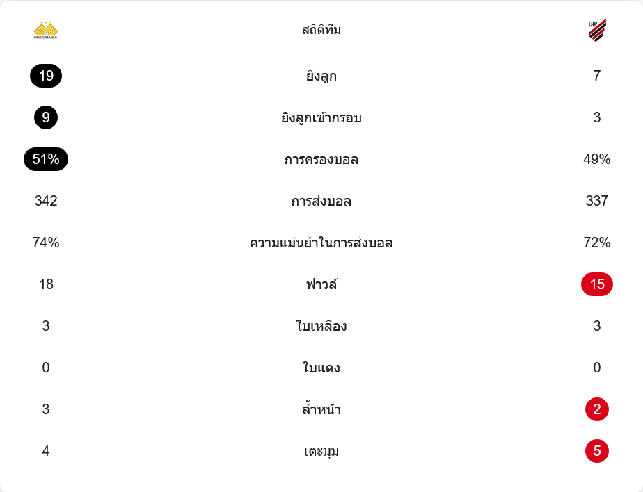 แม้เปอร์เซ็นต์การครองบอลจะใกล้เคียงกัน (คริคูม่า 51% ต่อ แอตเลติโก้ 49%) แต่เจ้าบ้านมีโอกาสยิงมากถึง 19 ครั้ง เข้ากรอบ 9 ครั้ง ขณะที่ทีมเยือนยิงเพียง 7 ครั้ง เข้ากรอบ 3 ครั้ง จำนวนการจ่ายบอลต่างกันไม่มาก (342 ต่อ 337) แต่คริคูม่ามีความแม่นยำ 74% เหนือกว่านิดหน่อย การเข้าปะทะก็เข้มข้นทั้งคู่ โดยคริคูม่าฟาวล์ 18 ครั้ง และแอตเลติโก้ 15 ครั้ง แต่ต่างฝ่ายต่างรับใบเหลืองเท่ากันที่ 3 ใบ