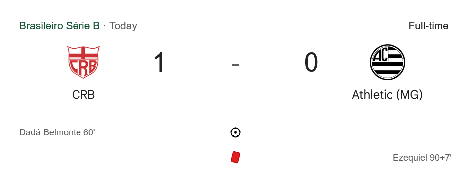 CRB เร่งเกมเร็วและสร้างแรงกดดันต่อเนื่อง จนนาทีที่ 60 แฟนบอลเจ้าบ้านได้เฮลั่นเมื่อ ดาด้า เบลมอนเต้ ยิงประตูสุดคมช่วยทีมขึ้นนำ 1-0 จากนั้นเกมเริ่มร้อนระอุ มีการปะทะและฟาวล์บ่อยครั้ง ทีมเยือนพยายามบุกทวงประตูคืนแต่เจอแนวรับเจ้าถิ่นสกัดไว้ได้ทั้งหมด ไฮไลต์ดราม่าเกิดขึ้นในช่วงทดเจ็บนาที 90+7 เมื่อ เอเซเกียล ของ Athletic MG โดนใบแดงไล่ออกจากสนามจากจังหวะฟาวล์รุนแรง ทำให้ความหวังของทีมเยือนดับสนิท จบเกม CRB เก็บสามแต้มในบ้านได้สำเร็จ