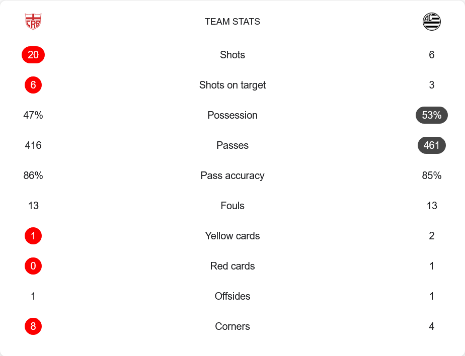 เกมนี้ CRB ยิงมากถึง 20 ครั้ง เข้ากรอบ 6 ครั้ง ครองบอล 47% ส่งบอล 416 ครั้ง ความแม่นยำ 86% ส่วน Athletic MG ยิง 6 ครั้ง เข้ากรอบ 3 ครั้ง ครองบอล 53% ส่งบอล 461 ครั้ง ความแม่นยำ 85% ทั้งสองทีมทำฟาวล์เท่ากันที่ 13 ครั้ง แต่ทีมเยือนได้ใบเหลือง 2 ใบและใบแดง 1 ใบ ขณะที่เจ้าถิ่นมีใบเหลืองเพียงใบเดียว CRB ได้เตะมุม 8 ครั้งมากกว่าทีมเยือนที่ได้เพียง 4 ครั้ง