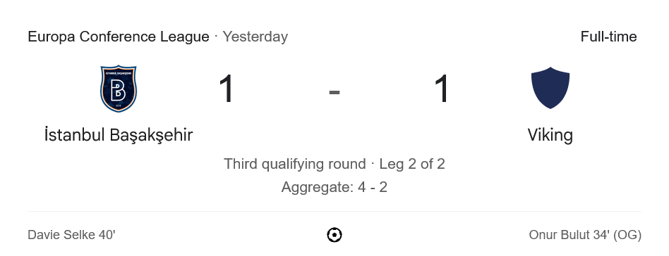 บาซัคเซเฮียร์เสมอในนัดนี้แต่รวมสองนัดชนะ 4-2 ผ่านเข้ารอบเพลย์ออฟยูฟ่ายูโรป้าคอนเฟอเรนซ์ลีก ขวัญกำลังใจเต็มเปี่ยมก่อนกลับไปเล่นลีก ส่วนไวกิ้งตกรอบแต่ได้ประสบการณ์ล้ำค่าในการเจอทีมใหญ่ยุโรป ซึ่งอาจช่วยให้ฟอร์มในลีกนอร์เวย์นิ่งขึ้น
