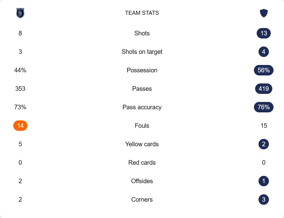 เกมนี้ไวกิ้งครองบอลมากกว่า 56% ต่อ 44% สร้างโอกาสยิงรวม 13 ครั้ง เข้ากรอบ 4 ส่วนเจ้าบ้านยิง 8 ครั้ง เข้ากรอบ 3 แต่บาซัคเซเฮียร์แม้ครองบอลน้อยแต่เล่นอย่างมีวินัย ฟาวล์รวม 14 ครั้ง ได้ใบเหลือง 5 ขณะที่ไวกิ้งฟาวล์ 15 ครั้ง ใบเหลือง 2 ครั้ง การจ่ายบอลของไวกิ้งแม่นยำกว่าเล็กน้อย 76% ต่อ 73% และได้เตะมุม 3 ครั้ง มากกว่าเจ้าบ้านที่ได้ 2 ครั้ง