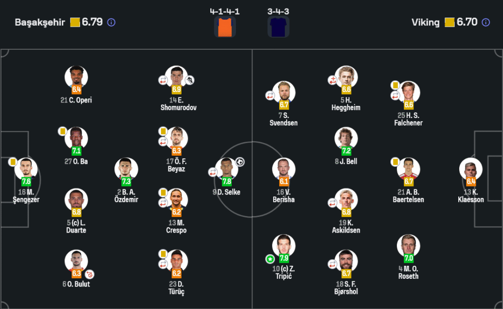 บาซัคเซเฮียร์ในระบบ 4-1-4-1 เน้นครองบอลและใช้แดนกลางคุมจังหวะการเล่น โครงสร้างเกมรับแข็งแกร่ง มีบาและออซเดมีร์ช่วยสกัดก่อนถึงแนวหลัง ส่วนเกมรุกอาศัยการเคลื่อนที่ของโชมูโรดอฟและเซลเก้เปิดพื้นที่ ไวกิ้งใช้ระบบ 3-4-3 ที่เน้นเกมริมเส้น เติมวิงแบ็กสูงเพื่อเปิดบอลเข้าเขตโทษ แต่ปัญหาคือเมื่อเสียบอลมักถูกสวนกลับเร็ว การป้องกันพื้นที่ด้านหลังกองหลังสามคนยังมีช่องให้โจมตี ในแง่แท็คติก การโต้กลับของเจ้าบ้านมีประสิทธิภาพกว่า แม้โอกาสยิงน้อยกว่า แต่สร้างความกดดันในจังหวะสำคัญได้ดีกว่า