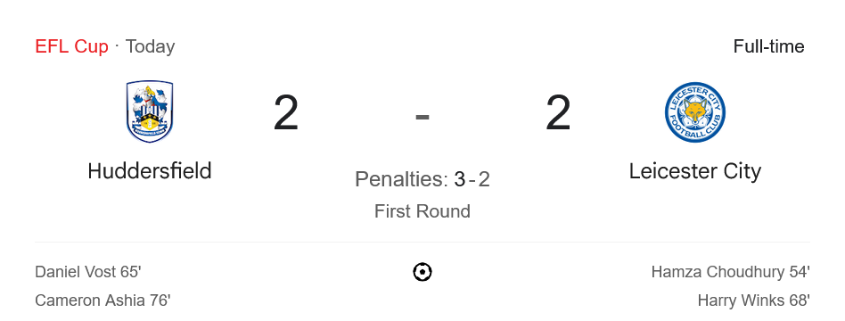 ตาม ตารางบอล ฮัดเดอร์ฟิลด์มีคิวเปิดบ้านรับดอนคาสเตอร์ในลีกวัน ส่วนเลสเตอร์จะไปเยือนเพรสตันในศึกแชมเปี้ยนชิพ เกมต่อไปของทั้งคู่จะเป็นบทพิสูจน์ว่าฟอร์มในถ้วยจะส่งผลต่อฟอร์มลีกหรือไม่