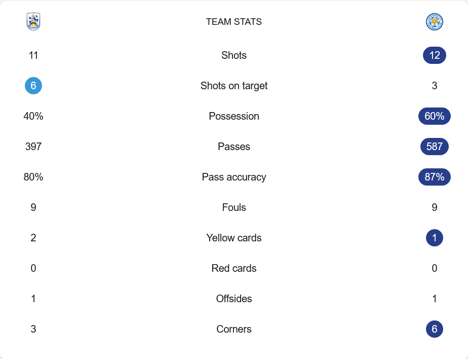 เลสเตอร์ครองบอลได้ถึง 60% และผ่านบอลแม่นยำ 87% เทียบกับฮัดเดอร์ฟิลด์ที่ครองบอล 40% ผ่านบอลแม่นยำ 80% แต่เจ้าบ้านมีจังหวะยิงตรงกรอบมากกว่า (6 ต่อ 3) บ่งบอกถึงความเฉียบคมในโอกาสที่มี ทั้งสองทีมทำฟาวล์พอๆ กันและไม่มีใบแดง แต่เลสเตอร์ได้ลูกเตะมุมมากกว่าอย่างชัดเจน (6 ต่อ 3)