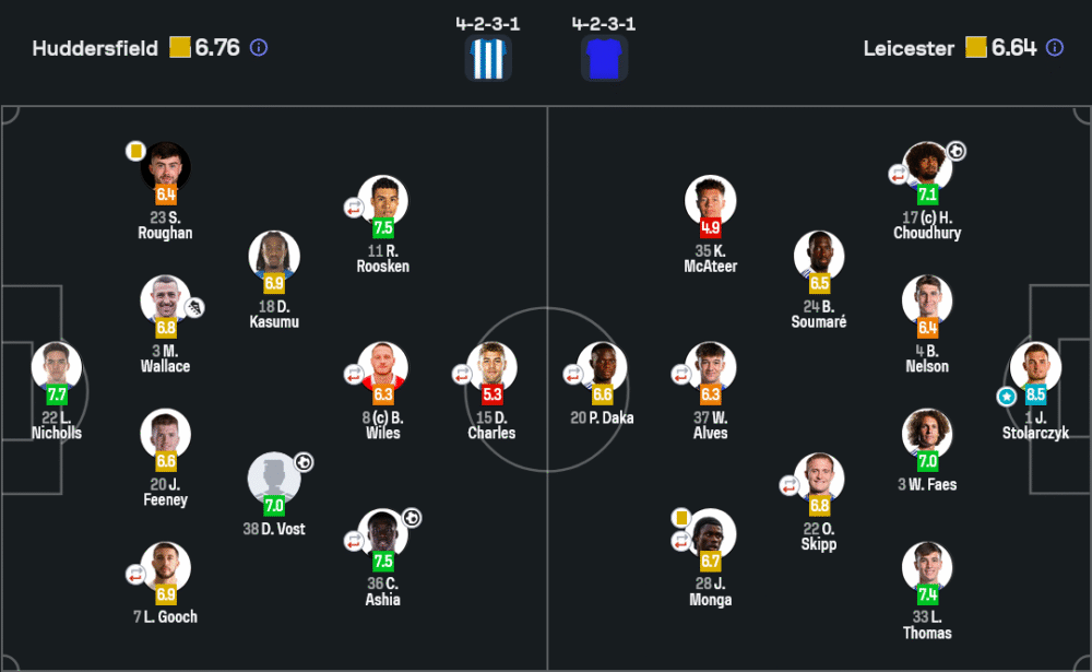 กองกลาง: เดวิด คาซูมู (6.9) – เบน ไวลส์ (6.3) – มาร์คัส วอลเลซ (6.8)