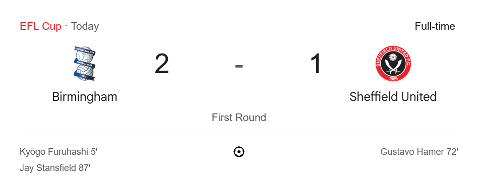 ศึกฟุตบอลถ้วย อีเอฟแอลคัพ รอบแรกเมื่อคืนที่ผ่านมา บ้านกีฬา พามาเกาะติด ผลบอล สุดมันส์ที่สนามเซนต์ แอนดรูว์ส เมื่อ เบอร์มิงแฮม ซิตี้ เปิดรังรับการมาเยือนของ เชฟฟิลด์ ยูไนเต็ด เกมนี้เต็มไปด้วยความดุดันและจังหวะบีบหัวใจ ก่อนที่เจ้าบ้านจะเป็นฝ่ายเฉือนชนะไปแบบสุดมัน 2-1