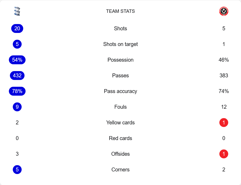 เบอร์มิงแฮมครองบอล 54% ต่อ 46% สร้างโอกาสยิงได้มากถึง 20 ครั้ง เข้ากรอบ 5 ครั้ง ขณะที่เชฟฯยูมีโอกาสเพียง 5 ครั้ง เข้ากรอบแค่ 1 ครั้ง การจ่ายบอลของเจ้าบ้านแม้จะมีความแม่นยำ 78% แต่เพียงพอในการควบคุมเกม ส่วนเชฟฯยูแม่นยำ 74% แต่ถูกตัดบอลกลางสนามบ่อยครั้ง เบอร์มิงแฮมยังสร้างแรงกดดันด้วยลูกตั้งเตะและการครอสจากริมเส้น แม้จะโดนฟาวล์เท่ากันที่ 9 ครั้ง แต่การเคลื่อนเกมรุกของเจ้าถิ่นเฉียบคมกว่า