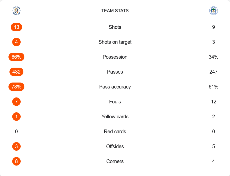 แม้สกอร์จะขาดเพียงประตูเดียว แต่รูปเกมแสดงให้เห็นความแตกต่างชัดเจน ลูตัน ทาวน์ครองบอลมากถึง 66% มีโอกาสยิง 13 ครั้ง เข้ากรอบ 4 ส่วนวีแกนครองบอลได้แค่ 34% และยิงเพียง 9 ครั้ง เข้ากรอบ 3 เกมรับของเจ้าถิ่นเหนียวแน่น ขณะที่เกมรุกทีมเยือนยังไร้ความเฉียบคม