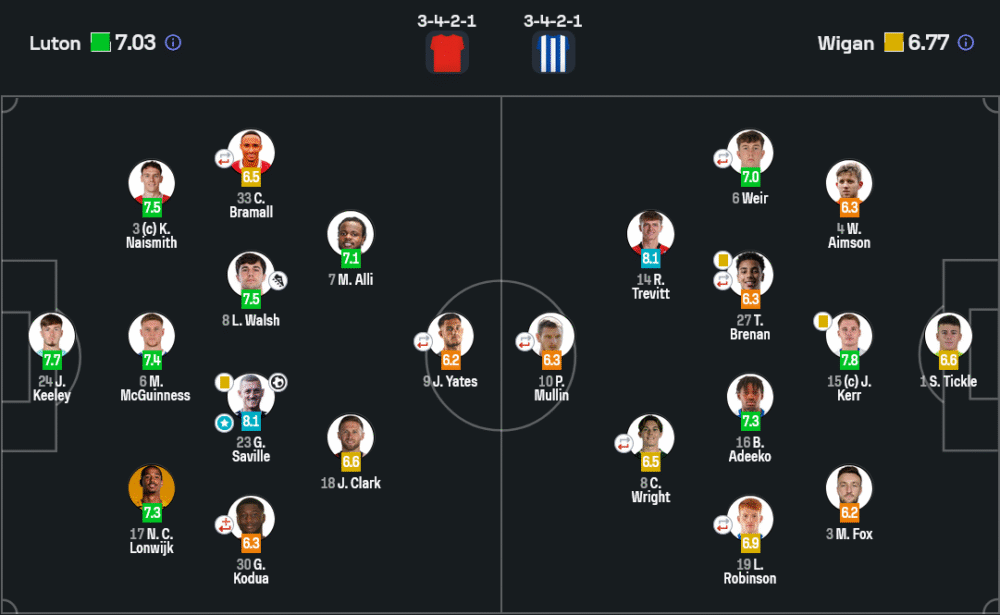 เกมนี้ ลูตัน ใช้ระบบ 3-4-2-1 เปิดเกมรุกเร็วตั้งแต่ต้น ใช้การเติมเกมริมเส้นจากวอลช์และนาอิสมิธ ขณะที่ซาวิลล์คุมจังหวะเกมกลางสนามจนสามารถสร้างโอกาสได้ต่อเนื่อง ส่วนเกมรับยังเหนียวแน่นปิดพื้นที่ไม่ให้วีแกนเจาะง่าย