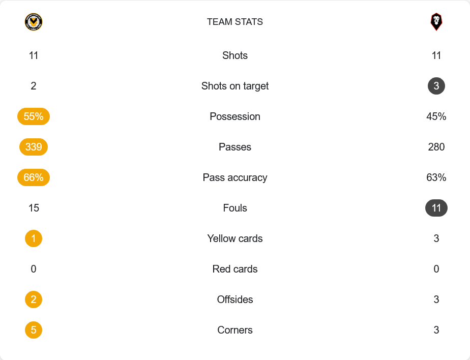 นิวพอร์ต เคาน์ตี้ ใช้แผน 5-3-2 เน้นการครองบอลจากแดนกลางและการบุกทางริมเส้น แต่ปัญหาหลักคือความคมในจังหวะสุดท้ายยังไม่เด็ดขาด ทำให้แม้จะมีโอกาสยิง 11 ครั้ง แต่ตรงกรอบเพียง 2 ครั้งเท่านั้น ส่วนเกมรับแม้จะตั้งโซนได้ดี แต่ก็พลาดเพียงครั้งเดียวจากลูกตั้งเตะ จนเสียประตู