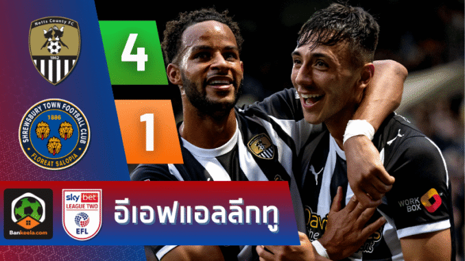 ศึก อีเอฟแอล ลีกทู คืนนี้ บ้านกีฬา ขอสรุป ผลบอลสด ที่สนามของ น็อตต์สเคาน์ตี้ ซึ่งเปิดรังโชว์ฟอร์มโหด ไล่ถล่ม ชรูว์สบิวรี่ ทาวน์ ไปด้วยสกอร์ 4-1 เกมนี้ถือเป็นการเรียกความมั่นใจของเจ้าถิ่นได้อย่างยอดเยี่ยม หลังเริ่มต้นฤดูกาลไม่ค่อยสดใส ส่วนทีมเยือน ชรูว์สบิวรี่ ยังคงจมท้ายตาราง ฟอร์มยังหาความแน่นอนไม่เจอ