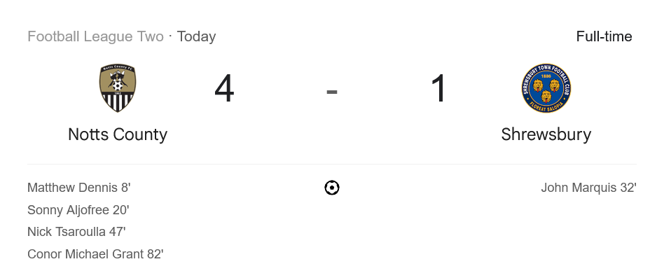บ้านผลบอล สรุปหลังเกม น็อตต์สเคาน์ตี้ เปิดบ้านถล่ม ชรูว์สบิวรี่ 4-1 กู้ศรัทธาในศึกอีเอฟแอลลีกทู