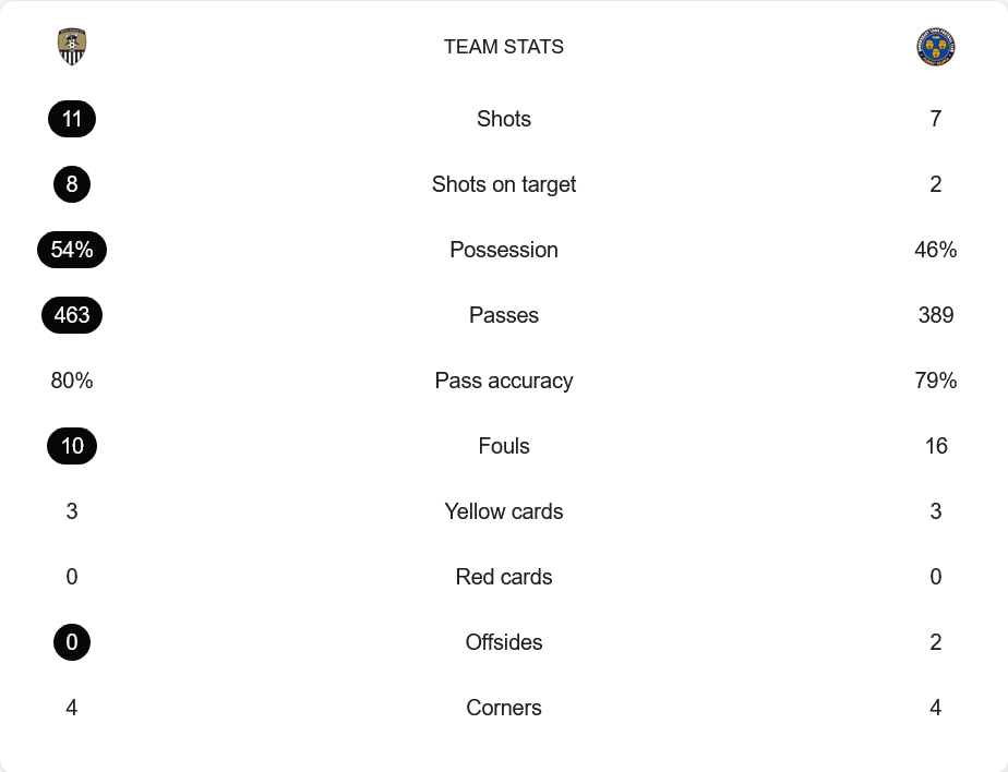 แม้ครองบอลน้อยกว่า แต่ น็อตต์สเคาน์ตี้ มีคุณภาพในพื้นที่สุดท้ายชัดเจน เจ้าถิ่นครองบอล 54% มีโอกาสยิง 11 ครั้ง เข้ากรอบถึง 8 ขณะที่ทีมเยือนครองบอล 46% ได้ยิงเพียง 7 ครั้ง เข้ากรอบแค่ 2 โอกาสเท่านั้น น็อตต์สเคาน์ตี้ ผ่านบอลแม่นยำ 80% ขณะที่ ชรูว์สบิวรี่ 79% แต่สิ่งที่ต่างกันคือการสร้างสรรค์จังหวะจบสกอร์ นอกจากนี้ทั้งสองทีมมีเกมที่หนักหน่วง ฟาวล์รวมกันกว่า 26 ครั้ง แจกใบเหลืองฝั่งละ 3 ใบ แต่ไม่มีใบแดงเกิดขึ้น