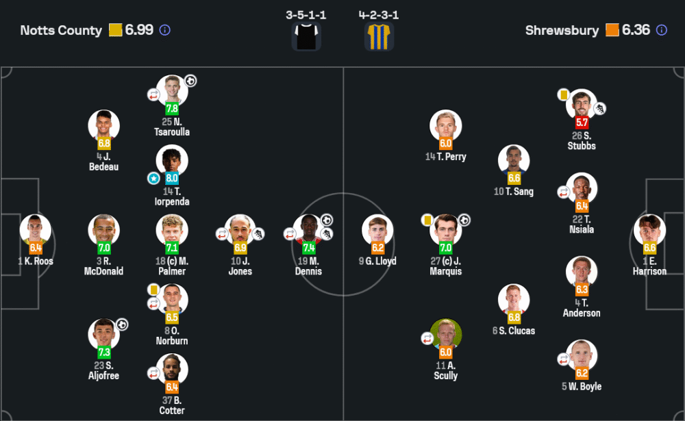 น็อตต์สเคาน์ตี้ วางหมากแบบ 3-5-1-1 ใช้การบุกริมเส้นและการสอดขึ้นจากแดนกลางเป็นอาวุธเด็ด เกมนี้การประสานงานของ ทซารูลล่า – เดนนิส – อิออร์เพนด้า ทำให้แนวรุกอันตรายตลอดเวลา ขณะที่เกมรับสามเซ็นเตอร์มีความแน่นอน รับมือกับจังหวะสวนกลับได้ดี