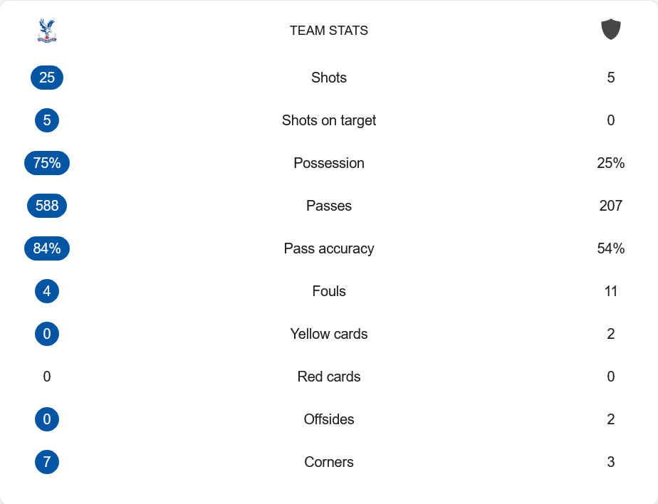 เกมนี้บ่งบอกชัดว่าพาเลซเหนือกว่าอย่างเต็มรูปแบบ พวกเขามีโอกาสยิงถึง 25 ครั้ง เข้ากรอบ 5 ครั้ง ขณะที่เฟรดริกซ์สตรัดไม่มีแม้แต่ลูกยิงตรงกรอบเดียว การครองบอล พาเลซทำได้ถึง 75% เทียบกับคู่แข่งเพียง 25% การจ่ายบอลเจ้าถิ่นมากถึง 588 ครั้ง แม่นยำ 84% ส่วนทีมเยือนจ่ายเพียง 207 ครั้ง แม่นยำต่ำแค่ 54% การฟาวล์พาเลซทำเพียง 4 ครั้ง แต่เฟรดริกซ์สตรัดถึง 11 ครั้ง แถมยังได้ใบเหลือง 2 ใบ