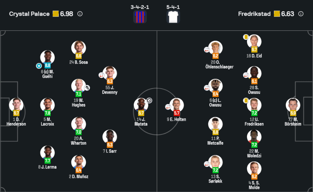 มาร์ค เกฮี กัปตันพาเลซเล่นได้อย่างแข็งแกร่งทั้งการคุมแนวรับและตัดบอลสำคัญๆ ค่ำคืนนี้เขาเป็นหัวใจหลักของทีม ทำให้แนวรุกเฟรดริกซ์สตรัดไม่สามารถสร้างโอกาสได้เลย ได้คะแนนสูงสุด 8.8 สมศักดิ์ศรีแมนออฟเดอะแมตช์