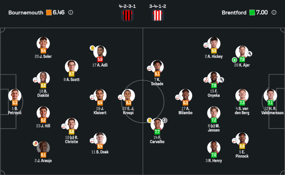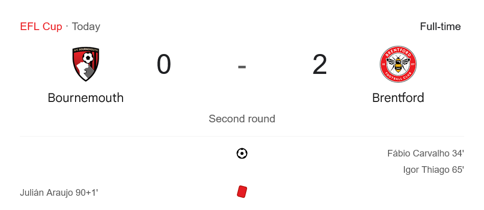 บอร์นมัธยังคุมบอลได้ แต่เจอเกมรับแน่นหนาของเบรนท์ฟอร์ดที่เล่นอย่างมีวินัย นาที 65 ความฝันเจ้าถิ่นแทบพังทลายเมื่อ อิกอร์ ติอาโก้ ตัวสำรองพังประตูที่สองให้ทีมเยือนหนีเป็น 2-0 จากนั้นเจ้าบ้านพยายามบุกอย่างหนักแต่ไร้ผล ซ้ำร้ายช่วงทดเจ็บ ฮูเลียน อเราโฆ โดนใบแดงไล่ออก ทำให้บอร์นมัธจบเกมด้วยความพ่ายแพ้สุดขมขื่น