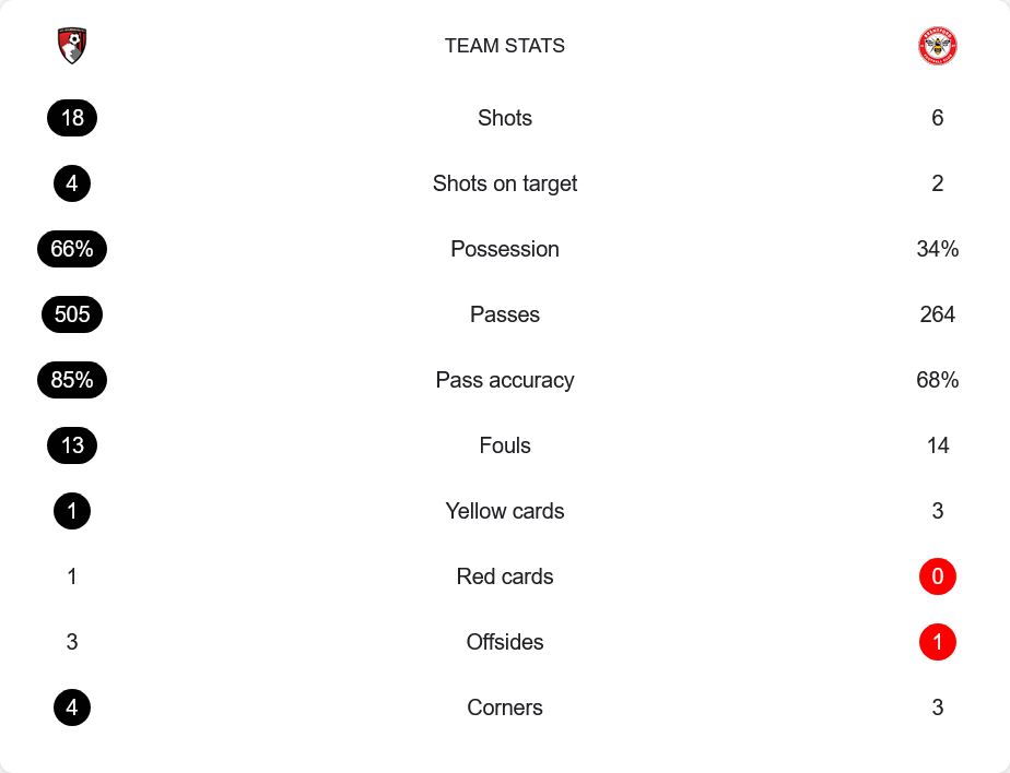 แม้บอร์นมัธจะเหนือกว่าทั้งการครองบอล 66% และจำนวนการผ่านบอลมากถึง 505 ครั้ง แต่ยิงตรงกรอบได้เพียง 4 ครั้ง ต่างจากเบรนท์ฟอร์ดที่มีเพียง 6 ครั้งแต่ตรงกรอบ 2 และเปลี่ยนเป็น 2 ประตูเต็ม เกมนี้ชี้ชัดถึงความแตกต่างในเรื่องความคมและการใช้โอกาส ขณะที่ใบเหลืองใบแดงก็มีผลต่อบรรยากาศท้ายเกมอย่างชัดเจน