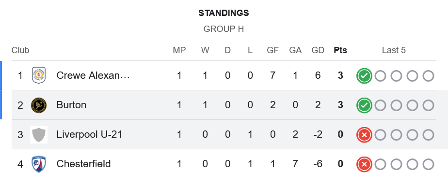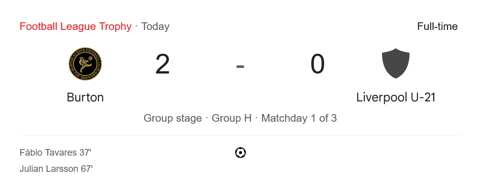 ชัยชนะนี้ส่งเบอร์ตันเก็บ 3 แต้มแรก อยู่ที่ 2 ของกลุ่ม H ผลต่าง +2 ตามหลังครูว์ อเล็กซานดราที่ถล่มเชสเตอร์ฟิลด์ 7-1 ส่วนลิเวอร์พูล ยู-21 พ่ายนัดแรก รั้งอันดับ 3 โอกาสยังมี แต่ต้องเก็บชัยชนะให้ได้ในสองนัดที่เหลือเพื่อรักษาเส้นทางเข้ารอบ