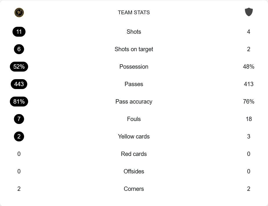 เบอร์ตันครองบอล 52% ยิง 11 ครั้ง เข้ากรอบ 6 ครั้ง ขณะที่ลิเวอร์พูล ยู-21 ครองบอล 48% ยิงเพียง 4 ครั้ง เข้ากรอบ 2 ครั้ง การจ่ายบอลใกล้เคียงกัน เบอร์ตัน 443 ครั้ง แม่นยำ 81% ส่วนลิเวอร์พูล 413 ครั้ง แม่นยำ 76% แต่สิ่งที่ต่างกันคือการสร้างสรรค์โอกาสที่เจ้าถิ่นเฉียบคมกว่า ฟาวล์เบอร์ตัน 7 ทีมเยือนสูงถึง 18 ใบเหลืองลิเวอร์พูลโดนไป 3