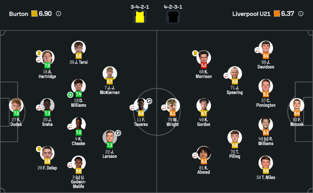 ดีแลน วิลเลียมส์ คือหัวใจเกมรุกของเบอร์ตัน สร้างสรรค์โอกาสจากแดนกลางได้ต่อเนื่อง เก็บบอลเชื่อมเกมกับแนวรุกได้ลื่นไหล มีส่วนร่วมทั้งสองประตู คะแนนสูงสุด 7.4 จาก Sofascore สมศักดิ์ศรีผู้เล่นยอดเยี่ยมของเกมนี้