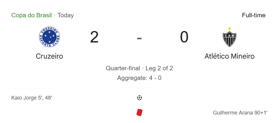 ศึกโคปา โด บราซิล รอบ 8 ทีมสุดท้าย นัดที่สอง ครูไซโร่ เปิดรังโชว์ฟอร์มดุดันทุบคู่ปรับร่วมแคว้นอย่าง แอตเลติโก มิไนโร่ 2-0 รวมผลสองนัด 4-0 ตบเท้าเข้าสู่รอบตัดเชือกอย่างสง่างาม เกมนี้แฟนบอลตามเช็ก ผลบอลสด กันมันส์หยดเพราะรูปเกมเต็มไปด้วยดราม่า ทั้งประตูสำคัญ ใบเหลือง และใบแดงปิดท้ายที่ทำให้บรรยากาศเดือดจนจบ