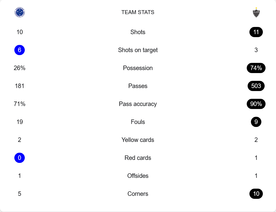 แม้แอตฯ มิไนโร่จะครองบอลสูงถึง 74% ผ่านบอลกว่า 500 ครั้ง ความแม่นยำถึง 90% แต่โอกาสยิงเข้ากรอบเพียง 3 ครั้ง ขณะที่ครูไซโร่ครองบอลแค่ 26% ผ่านบอล 181 ครั้ง แต่เข้ากรอบถึง 6 ครั้งและเปลี่ยนเป็น 2 ประตูสำคัญ ฟาวล์รวม 28 ครั้ง ใบเหลืองฝั่งละ 2 แต่เกมนี้ปิดฉากด้วยใบแดงของอาราน่าที่ทำให้แอตฯ มิไนโร่เสียศูนย์