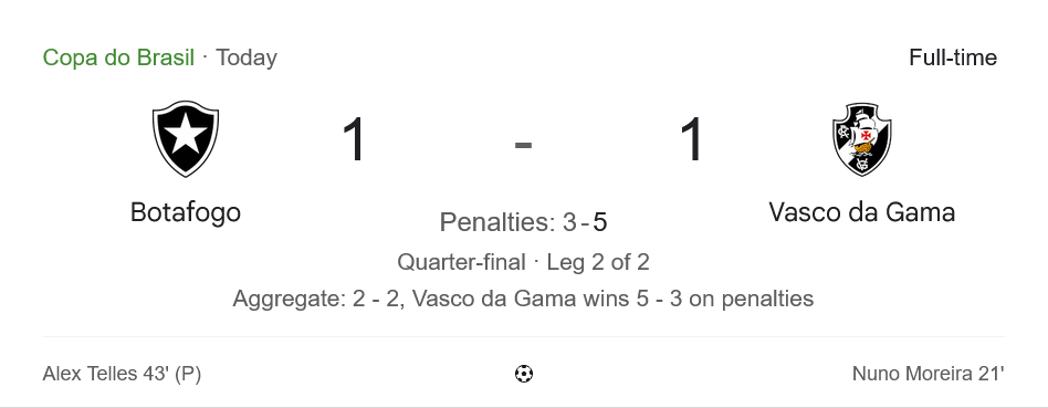 ศึกโคปา โด บราซิล รอบ 8 ทีมสุดท้าย นัดสอง เกมสุดมันส์ที่สนามโบตาโฟโก้ เจ้าถิ่นเปิดบ้านเจอศัตรูร่วมลีกอย่างวาสโก ดา กาม่า จบ 90 นาทีเสมอ 1-1 รวมผลสองนัด 2-2 ต้องลากไปตัดสินด้วยจุดโทษ และกลายเป็นวาสโกที่เฉียบคมกว่า ยิงเข้า 5-3 ผ่านเข้ารอบรองชนะเลิศได้สำเร็จ งานนี้แฟนบอลเช็ก ผลบอลสด กันตาแทบไม่กะพริบ เพราะเกมเต็มไปด้วยความเข้มข้นทั้งรูปเกมและดราม่าช่วงท้าย
