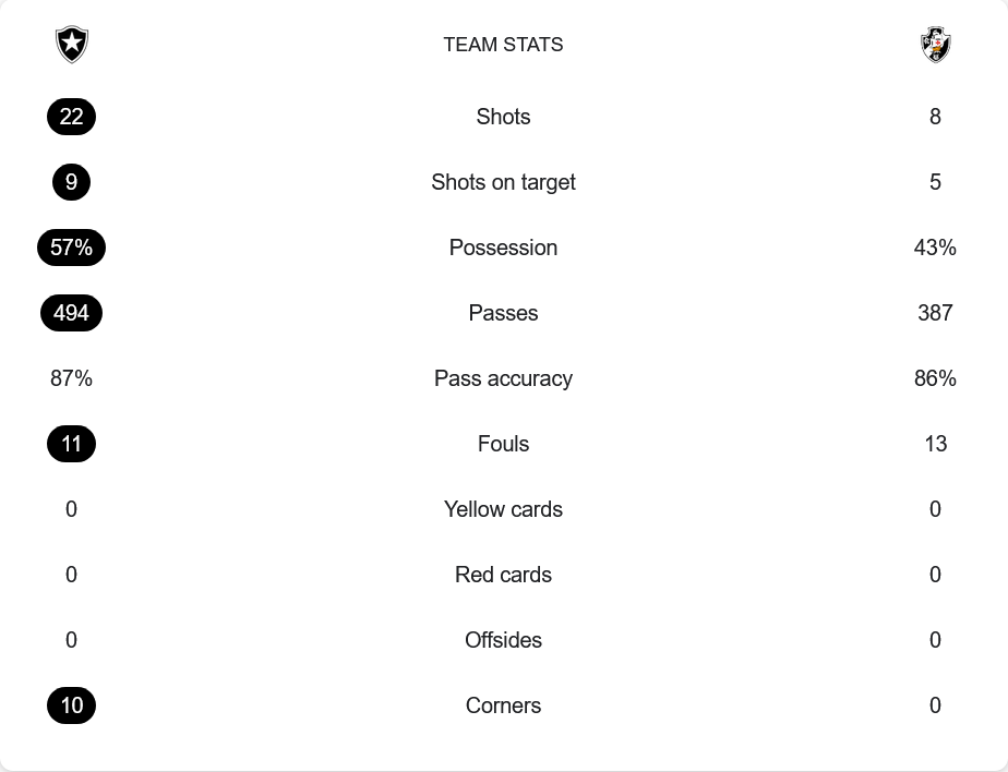 โบตาโฟโก้ครองบอลเหนือกว่าที่ 57% จ่ายบอล 494 ครั้ง ความแม่นยำ 87% ยิงทั้งหมด 22 ครั้ง เข้ากรอบ 9 แต่เปลี่ยนเป็นประตูได้เพียงลูกเดียว ขณะที่วาสโกครองบอล 43% จ่ายบอล 387 ครั้ง ความแม่นยำ 86% มีโอกาสยิง 8 ครั้ง เข้ากรอบ 5 และได้ประตูสำคัญจาก นูโน่ โมเรยร่า ทั้งสองทีมแทบไม่พลาดเรื่องวินัย ไม่มีใบเหลืองหรือใบแดงในเกมนี้