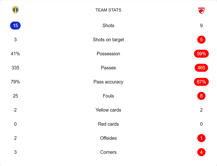 เกมนี้ ดินาโม ครองบอลมากกว่าชัดเจนที่ 59% เทียบกับเจ้าถิ่น 41% จ่ายบอล 465 ครั้ง ความแม่นยำสูงถึง 87% และมีโอกาสยิงตรงกรอบ 5 ครั้งจาก 9 ครั้ง ส่วน ปิโตรลูล แม้จะยิงมากกว่า 15 ครั้ง แต่ตรงกรอบเพียง 3 ครั้งเท่านั้น การเข้าทำไม่เด็ดขาด ขณะที่เกมรับยังเปิดช่องให้คู่แข่งเจาะได้ง่าย