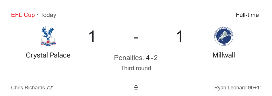 แม้เกมนี้จะเป็นถ้วยคาราบาวคัพ ไม่เกี่ยวข้องกับคะแนนลีกโดยตรง แต่ชัยชนะครั้งนี้สร้างความมั่นใจให้คริสตัลพาเลซต่อเนื่อง หลังฟอร์มในพรีเมียร์ลีกเริ่มเข้าที่ ส่วนมิลล์วอลล์ต้องกลับไปโฟกัสในศึกแชมเปี้ยนชิพที่ยังรอแต้มสำคัญในการขยับอันดับ