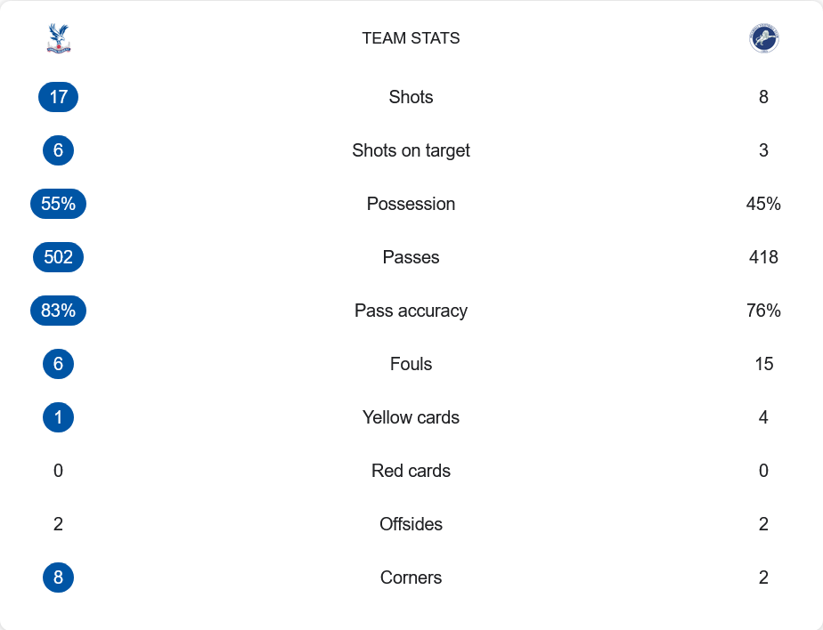 เกมนี้พาเลซยิงทั้งหมด 17 ครั้ง เข้ากรอบ 6 ครั้ง ขณะที่มิลล์วอลล์ยิงเพียง 8 ครั้ง เข้ากรอบ 3 ครั้ง อัตราครองบอลเป็นของพาเลซ 55% ต่อ 45% การจ่ายบอลของพาเลซแม่นยำ 83% เหนือกว่ามิลล์วอลล์ที่ทำได้ 76% แม้พาเลซทำฟาวล์น้อยกว่า (6 ครั้ง) แต่มิลล์วอลล์กลับโดนใบเหลืองถึง 4 ใบ เทียบกับพาเลซที่ได้เพียง 1 ใบ