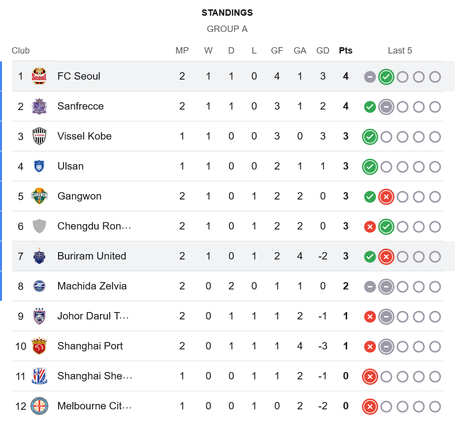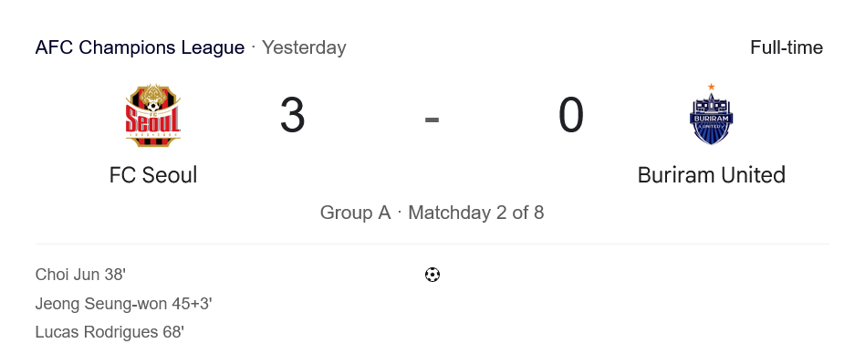 ชัยชนะนัดนี้ทำให้ FC Seoul เก็บเพิ่มเป็น 4 คะแนนจาก 2 นัด ขยับยึดหัวตารางกลุ่ม A อย่างเข้มข้น มีแต้มเท่าซานเฟรชเชแต่ผลงานได้เสียดีกว่า ส่วน บุรีรัมย์ ยูไนเต็ด มี 3 คะแนนจาก 2 นัด อยู่ในกลุ่มกลาง–ล่างของตาราง ต้องเร่งเครื่องในเกมถัดไปเพื่อกลับมาสู่เส้นทางลุ้นเข้ารอบ