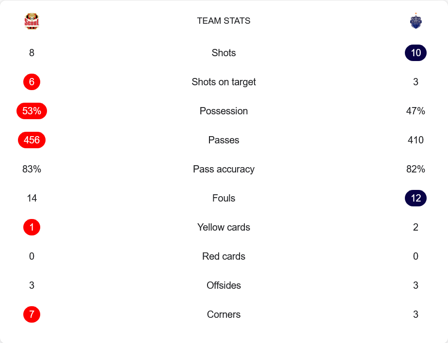 - ⚽️ 38’ 1-0 FC Seoul: Jun Choi ยิงจ่อ จากจ่าย/ครอสของ Lucas Silva